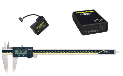 Mitutoyo Caliper to PC Wireless Package with MobileCollect This complete package provides all of the items required to be able to measure your products with a Mitutoyo 0-12" Digital Caliper, and then send the measured data to a PC via MicroRidge's wireless gage interface system, MobileCollect. The incoming data can be converted to a keyboard style entry, so wherever you can type in data is where your incoming data will be placed. Works great with MS Word, Excel..., even SPC software packages. Complete package includes the following... Mitutoyo Digital Caliper w/SPC Output 0-12" / 300mm Measuring Range 0.0005" / 0.01mm Resolution MobileCollect Interface Cable MobileCollect Transmitter MobileCollect Base (Receiver) USB connecting cable MobileCollect programming software