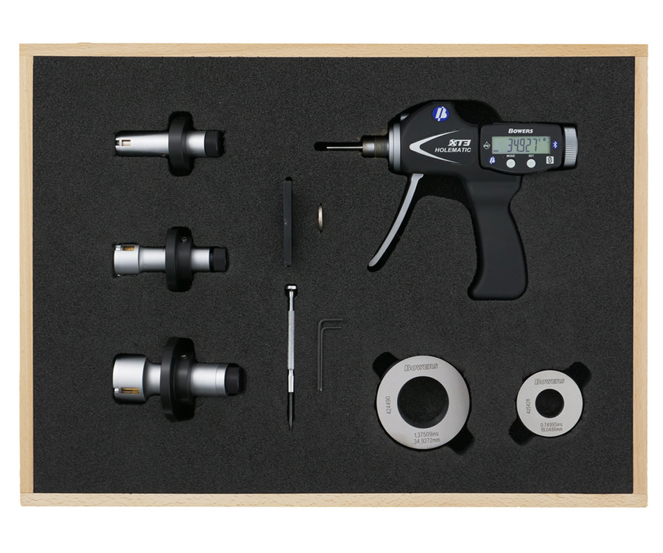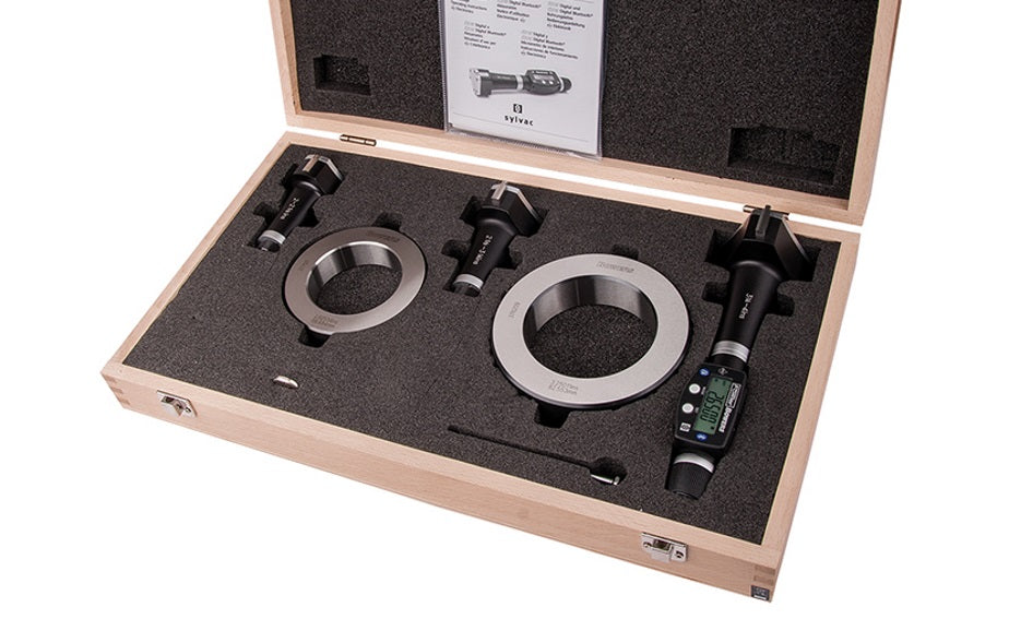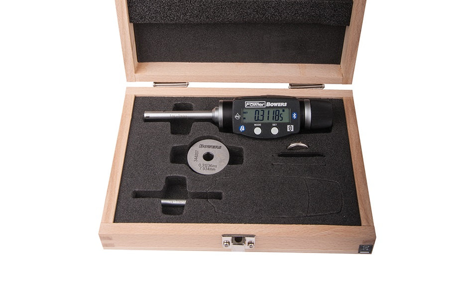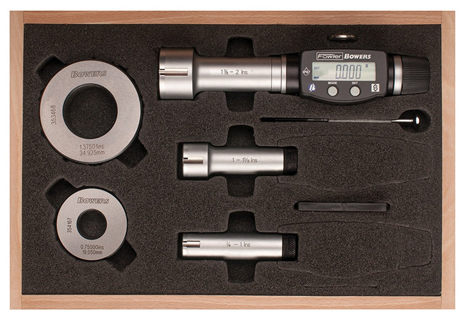 These Fowler Digital Holemike Sets include multiple measuring heads that allow you to cover a wider measuring range, multiple setting rings, and a Digital Display, all stored in a wood case.