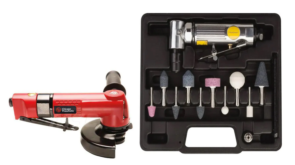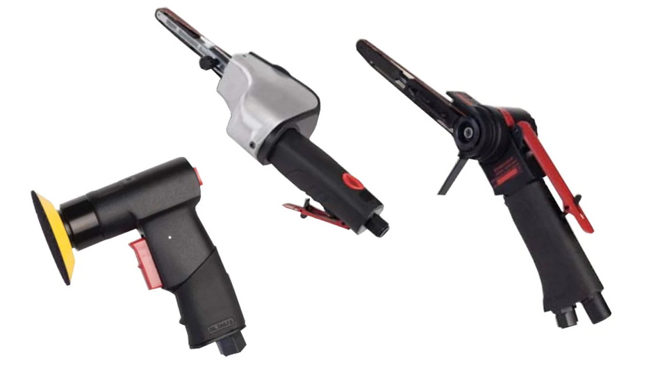 Air Sanders, Grinders, Impact Wrenches & Ratchets: These are pneumatic tools that are commonly used in machine shops for surface preparation, grinding, and polishing of various materials. Air sanders typically use sandpaper or other abrasive materials to remove surface imperfections, while air grinders use grinding wheels to shape and remove material. Both types of tools are powered by compressed air and can vary in size and shape depending on the specific application.