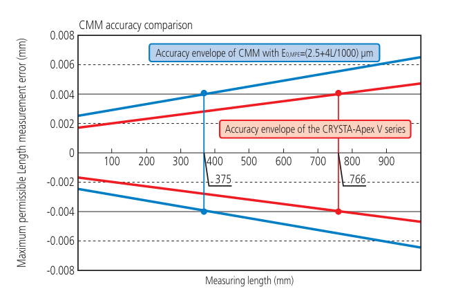 The CRYSTA-Apex V Series guarantees a maximum permissible length measurement error or E0, MPE, of 1.7+3L/1000 µm. Let’s consider a CMM offering E0, MPE of approximately 2.5+4L/1000 µm, which would generally be considered high-accuracy. If, for example, the required tolerance on a dimension is±0.02 mm, the uncertainty of this machine would exceed one-fifth of this value* (±0.004 mm, as shown on diagram at right) for any measured length over 375 mm. In contrast, with the V Series, the measurement uncertainty remains within one-fifth of the required tolerance for measuring lengths up to 766 mm. Although the difference in the first term accuracy specification between the two machines may seem small (a mere 0.8µm), the V Series actually offers guaranteed accuracy for more than double the measuring range.