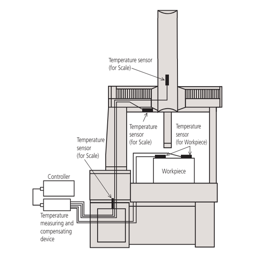 In the past, the accuracy of CMMs could not be guaranteed unless they were installed in constant temperature rooms. The temperature compensation feature guarantees accuracy under temperature conditions of 16-26 °C. This feature measures the temperature of the workpiece and that of the measuring machine, calculates what the measurement value would be at 20 °C, and outputs this value as the measurement result.