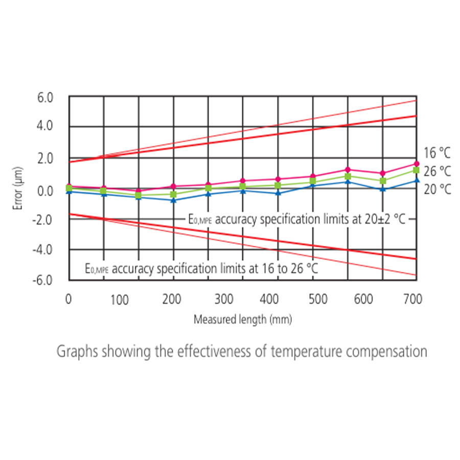 A real-time temperature compensation system that greatly contributes to measurement accuracy; a maximum permissible length measurement error of 1.7 µm (i.e. 2 µm uncertainty for a measured length of 100 mm) guaranteeing high-accuracy measurements of the most intricate workpieces; and enhanced repeatability.