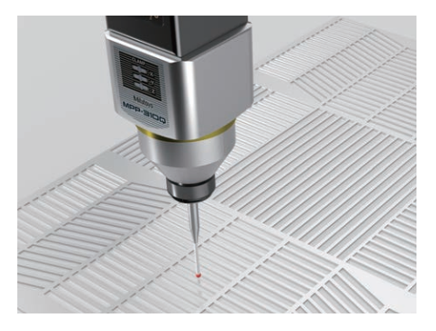 Non-contact laser probes require dramatically less measurement time compared to contact (scanning) probes. Scanning at once from three directions enables simultaneous measurement of the top and side faces, which means less repositioning and efficient measurement of even the most intricate workpieces.