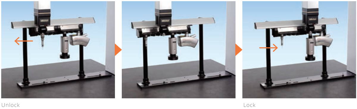 Necessary when using probes that do not support automatic stylus exchange for fully automated measurements that require changes in stylus diameter and/or length. Also necessary for fully automated measurements that require switching between contact and non-contact probes. Now with a simpler structure and increased durability, as a result of a new mechanism that uses the drive of the CNC CMM for automatic exchange.