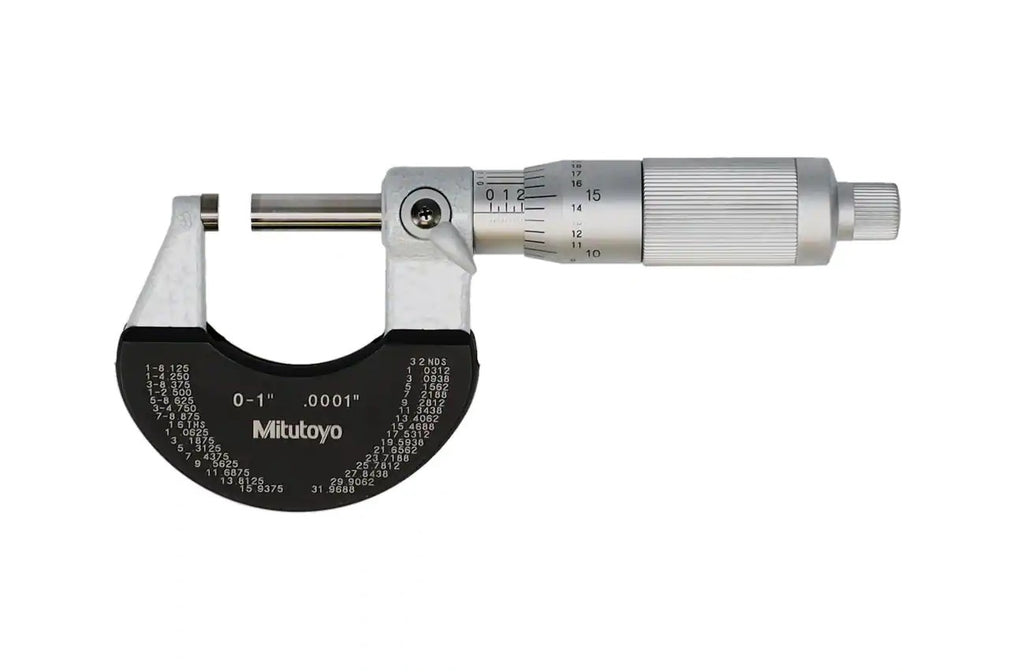 Mitutoyo Outside Micrometer Features include... 0-1" Measuring Range 0.0001" Graduations Friction Thimble Carbide Measuring Faces Tapered (on the anvil side) for hard-to-reach places. Supplied in fitted plastic case.