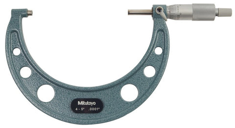 Mitutoyo Outside Micrometer Features include... 4-5" Measuring Range 0.0001" Graduations + .0001" Accuracy With Ratchet Stop With Standard Hammertone-green, baked-enamel finished frame