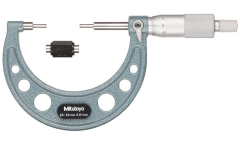 Mitutoyo Spline Micrometer The anvil and spindle have a small diameter for measuring splined shafts, slots, and keyways. Features include... 25-50mm Measuring Range 0.01mm Graduations + 3um Accuracy 3mm Spline Diameter Ratchet Stop for constant force Supplied in fitted case