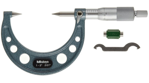 Mitutoyo 15° Carbide Point Micrometer Pointed spindle and anvil for measuring the web thickness of drills, small grooves, keyways, and other hard-to-reach dimensions. Features include... 1-2" Measuring Range 0.001" Graduations + 0.00015" Accuracy 15° Point Carbide Tip Ratchet Stop for constant force Supplied in fitted case
