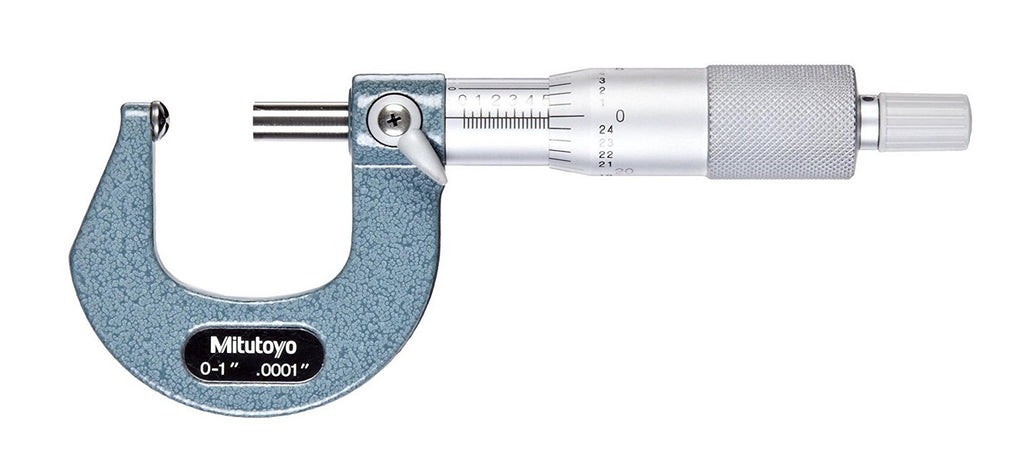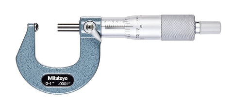 Mitutoyo Spherical Face Flat Spindle Micrometer Features include... 0-1" Measuring Range + 0.00015" Accuracy Spherical Anvil Flat Spindle With Ratchet Stop for constant force Supplied in fitted plastic case