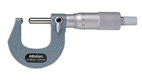 Mitutoyo Spherical Face Anvil & Spindle Micrometer Features include... 0-25mm Measuring Range 0.01mm Graduations + 3um Accuracy Spherical Anvil Spherical Spindle With Ratchet Stop for constant force Supplied in fitted plastic case