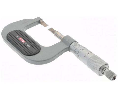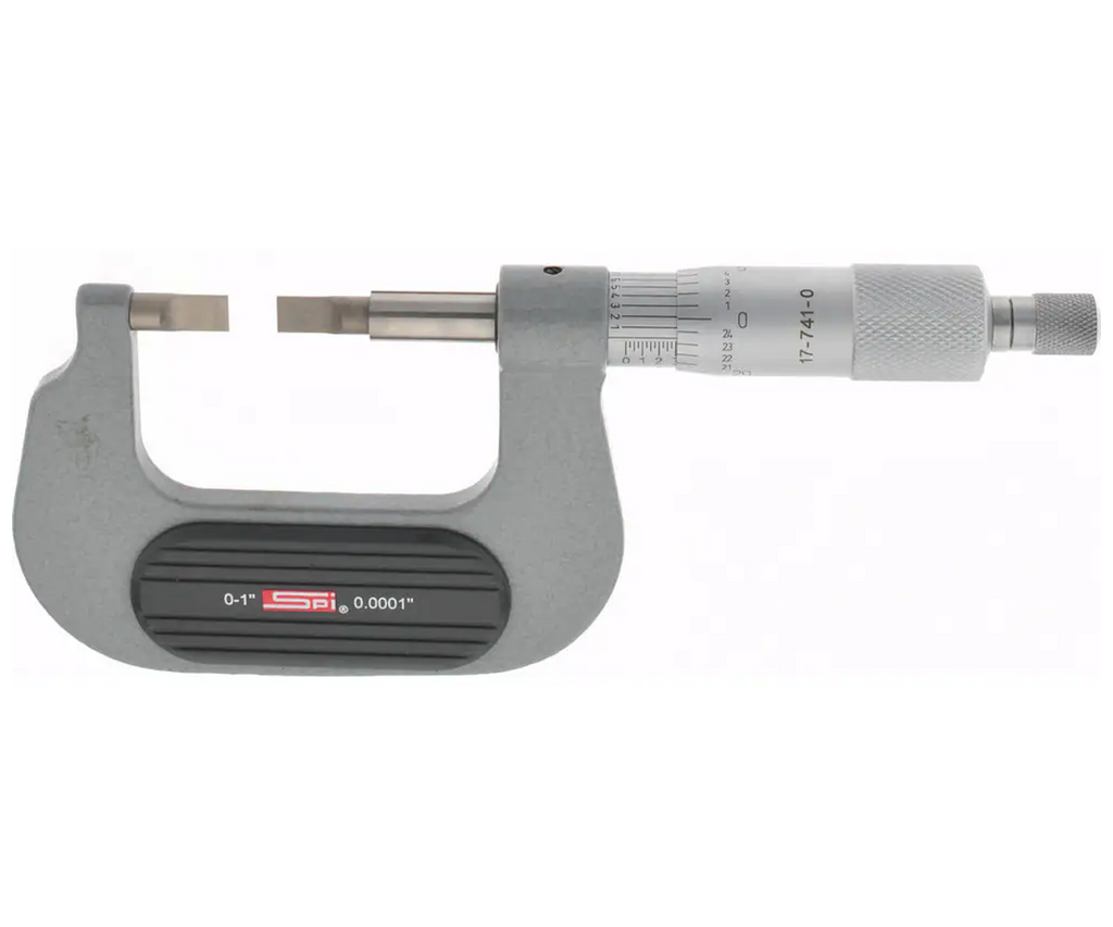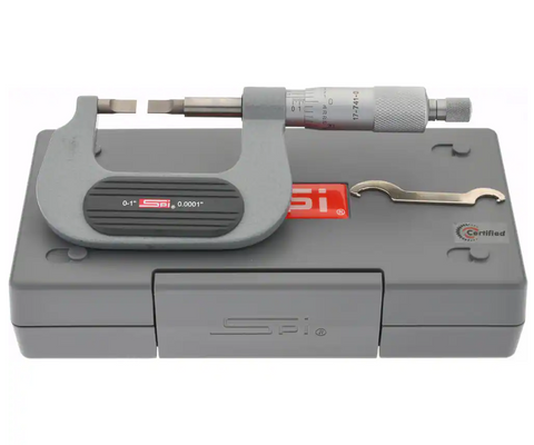 SPI Blade Micrometer Measures narrow grooves and hard to reach areas. Features include... 0-1" Measuring Range 0.0001" Graduations + 0.0001" Accuracy 0.03" Blade Thickness 0.25" Blade Length 0.25" Non-Rotating Spindle diameter Includes Calibration Certificate