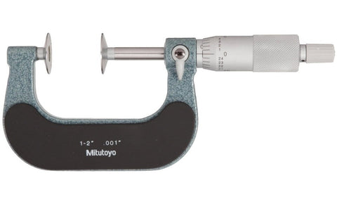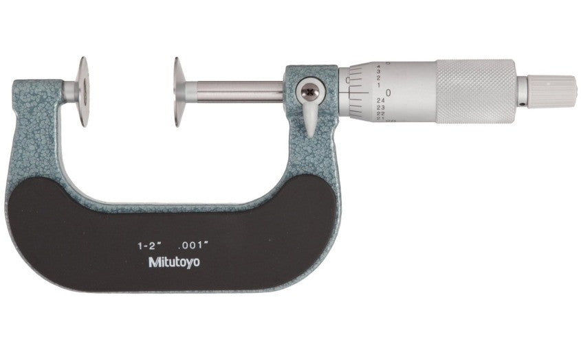 Mitutoyo Disc Micrometer Disc flanges on micrometer make it possible to get accurate measurements on areas not reachable with standard micrometers such as gear pitch, ribs, slot and groove distances. Features Include... 1-2" Measuring Range 0.001" Graduation + .00002" Accuracy Disc flange dia.: .787" / 20 mm Ratchet Stop for constant force Lever lock Furnished in fitted case
