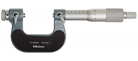 Mitutoyo Screw Thread Micrometer Interchangeable Anvil Type Micrometer Specifications include... 0-25mm Measuring Range 0.01mm Graduations + 4um Accuracy Features include... For use with 55° or 60° interchangeable anvils Ratchet Stop Supplied in fitted case Interchangeable Anvils Sold Separately 55° Anvils: # 126-810 60° Anvils: # 126-800