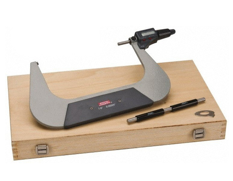 SPI Digital Micrometer - IP54 Rated Protection Features Include... 7-8" / 175-200mm Measuring Range 0.00005" / 0.001mm Resolution Carbide measuring faces Standard included above 0-1" range Inc./Abs. measuring Spindle dia: 0.250 Accuracy: 0.00028" Friction Thimble Spindle lock Includes Certificate of Calibration Furnished in fitted case
