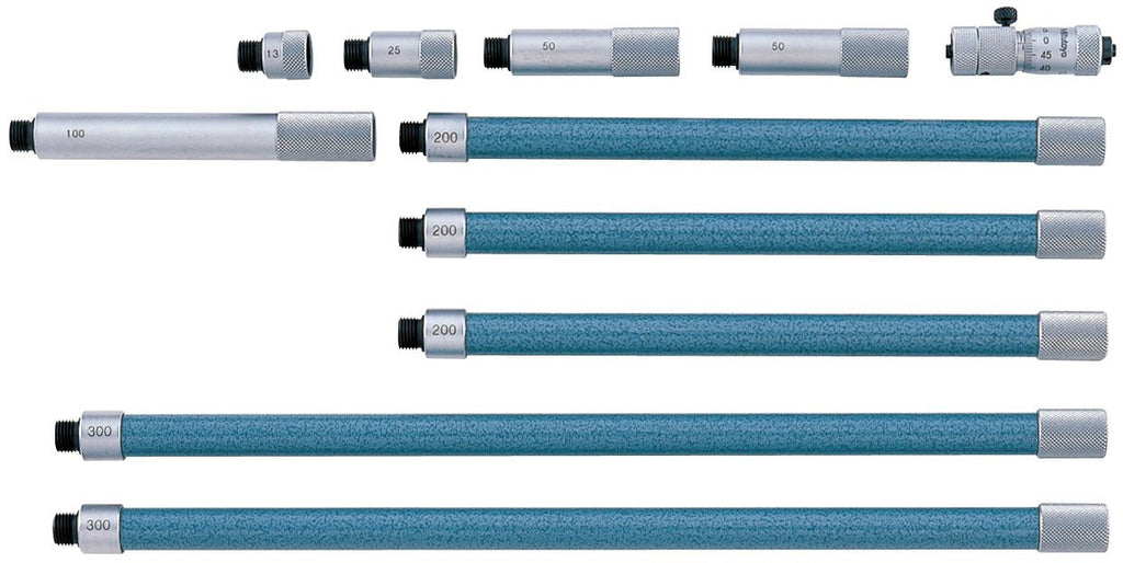 Mitutoyo Tubular Inside Micrometer Set This set allows you to measure a wide range of ID measurements by combining extension rods (pipes) and anvils with the micrometer head. Carbide-tipped measuring faces are available. Specifications include... 50-1500mm Measuring Range 0.01mm Grads Accuracy: +(3+n+L/50)um L=Maximum Measuring length (mm) n=Number of Rods Fraction rounded up Set includes... Micrometer Head Extension Rods 13mm, 25mm, 50mm (2 pcs), 100mm, 200mm (3 pcs), 300mm (2 pcs)