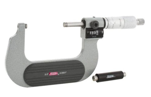 SPI Mechanical Digit Counter Outside Micrometer Mechanical Digit Counter for Quick Error Free Reading Features Include... 2-3" Measuring Range 0.0001" Graduations + 0.0002" Accuracy Carbide measuring faces Chrome plated frame with plastic heat shield. Ratchet thimble Spindle lock. Spindle dia. 0.250" Furnished in fitted case Certificate of Calibration included