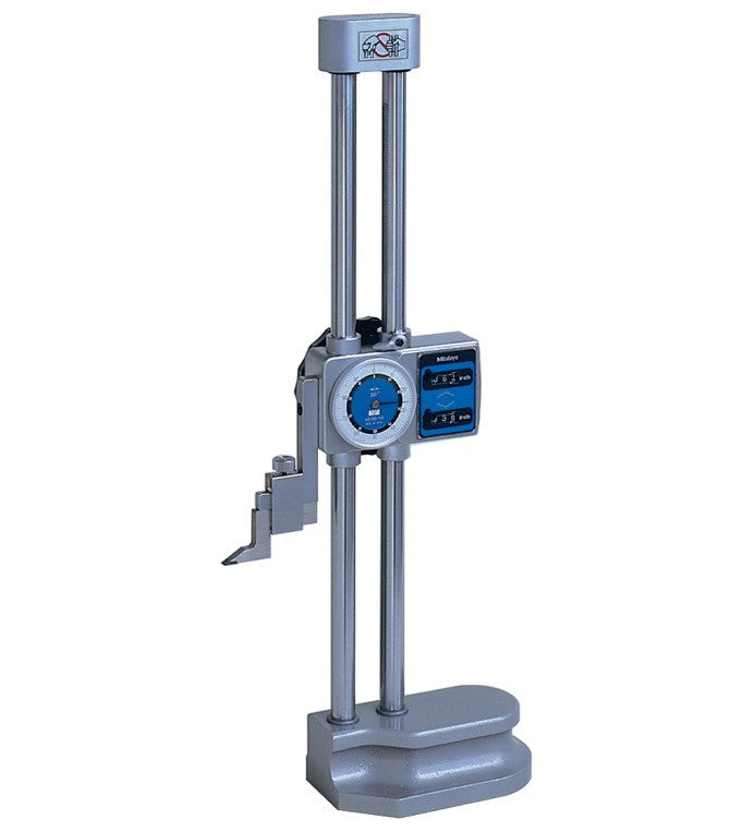 Mitutoyo Double Column Dial Height Gage Features include... 0-18" Measuring Range 0.001" Graduations Easy and error-free reading with both up and down digital counters as well as a dial. Provided with a feed wheel for easy coarse feeding. Carbide-tipped scriber is provided. The counters and dial can be re-zeroed at any scriber position. Standard Scriber Provided