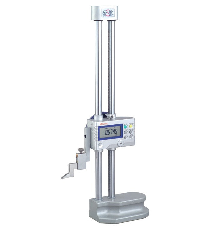 Mitutoyo 0-12" Digimatic Height Gage Features include... Easy-to-use standard type. Carbide-tipped scriber is provided. Double-column structure ensures high measuring accuracy. Coarse/fine feed switching. Technical Data... 0-12" / 300mm Measuring Range 0.0005" / 0.01mm Resolution Accuracy: Refer to the list of specifications. (excluding quantizing error for digital models) Resolution: 0.01mm or .0005"/0.01mm Display: LCD, 6-digit Max. response speed: 500mm/s Battery: CR2032 lithium (1 pc.), 05SAA217 Battery life: Approx. 2000 hours under normal use Functions... Zero-setting, ABS/INC switching, Presetting, Probe tip diameter compensation, -/+ switching, Power ON/OFF, Data hold, SPC Output, inch/mm conversion (inch/mm models) Alarm: Low voltage, Counting value composition error Standard Scriber Provided