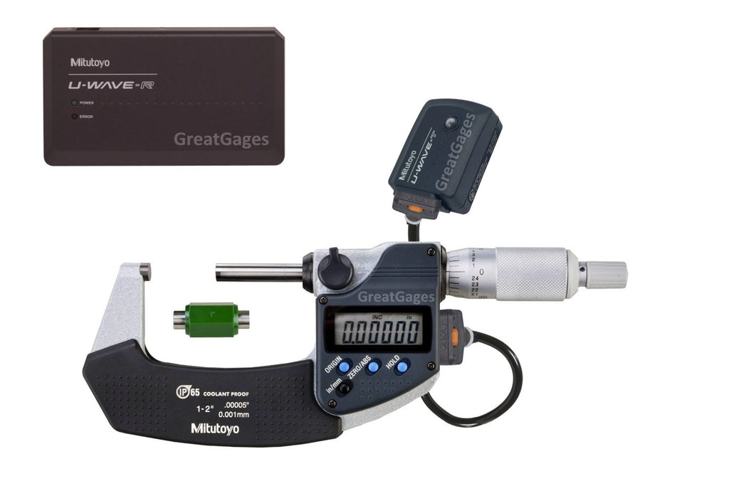 Mitutoyo Micrometer 1-2" to PC Wireless Package U-Wave This complete package provides all of the items required to be able to measure your products with a Mitutoyo 0-1" Digital Micrometer, and then send the measured data to a PC via Mitutoyo's U-Wave wireless gage interface system. The incoming data can be converted to a keyboard style entry, so wherever you can type in data is where your incoming data will be placed. Works great with MS Word, Excel..., even SPC software packages. Complete package includes the following... Mitutoyo 0-1" Disc Digital Micrometer w/SPC Output U-Wave Cable U-Wave Transmitter U-Wave Receiver w/USB connecting cable and U-Wave software Mitutoyo Digital Micrometer Features... 0-1" / 25mm Measuring Range 0.00005" / 0.001mm Resolution