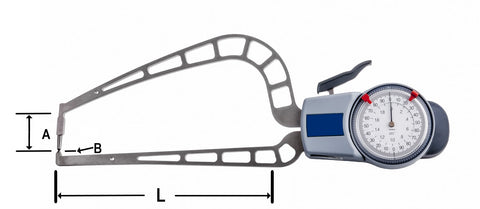 Long Reach Thickness Gage This thickness gage is designed to help you measure thickness applications that are hard to reach areas. When you have a lip or ledge that you need to get over to measure your parts, this easy-to-use, operator friendly gage provides a direct, fast and accurate reading. Specifications include... 0-2" Measuring Range 2" Max Contact Travel 6.81" Arm Reach (Dimension L) 1.26" Contact Length Upper (Dimension A) 0.079" Contact Length Lower (Dimension B) 3mm Diameter Ball Tip on both upper and lower arms 0.001" Graduations