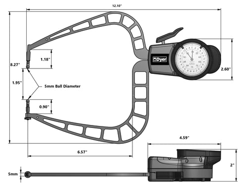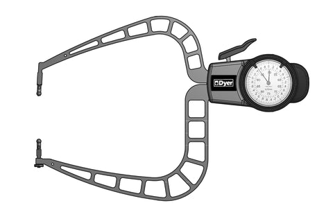 Long Reach Dial Thickness Gage This versatile Large OD measuring gage for hole diameters, groove thickness, tube thickness, and hard to reach dimensions. Make for fast, accurate, and repeatable measuring. Features include... 2" - 4" Measuring Range 0.001" Graduation 6.57" Max Measuring Depth 1.18" Upper Contact Point Length .9" Lower Contact Point Length 0.196" / 5mm dia Ball on both tips