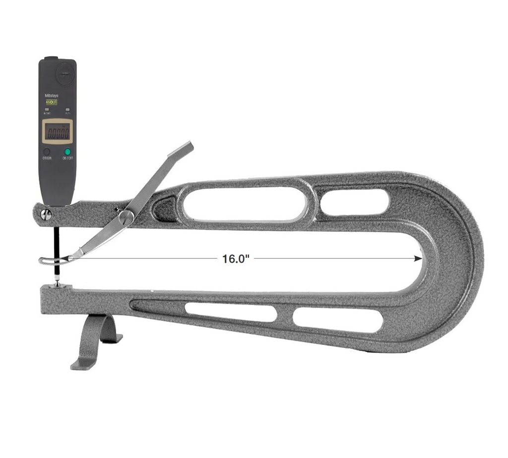 Electronic Thickness Gage with Mitutoyo Digital Indicator Deep Throat Thickness Gages are precision measuring tools used to measure the thickness of materials in hard-to-reach or confined areas. They are designed with an extended reach or "throat" that allows them to measure the thickness of materials in areas where traditional thickness gages cannot reach. This gage includes a 1" measuring range and a 16" deep reach, allowing you to measure thin material in hard to reach places. The attached lifting lever makes for one-handed operation, and the included Mitutoyo Digital Indicator includes the following specifications. 0-1" / 0-25.4mm Measuring Range 0.0005" / 0.01mm Resolution 16" Reach SPC Output This gage takes approximately 2 weeks for production before shipping. Please specify Tip Style when ordering!