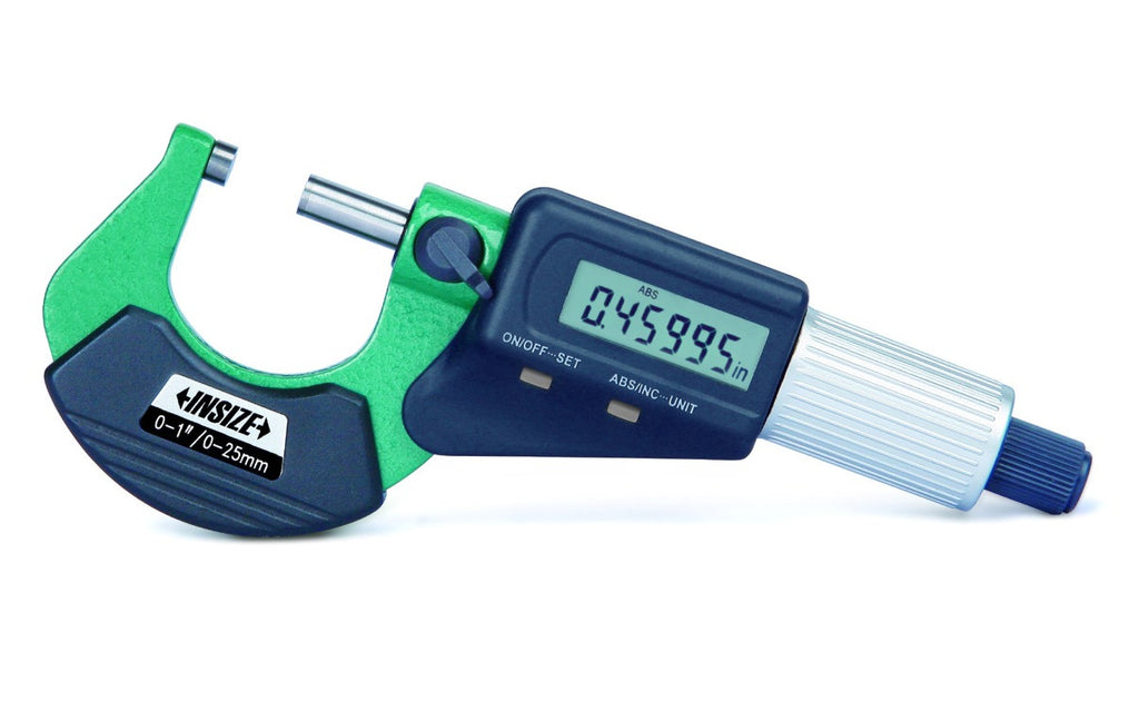 INSIZE Electronic Micrometer Features include... 3-4" / 75-100mm Measuring Range 0.00005” / 0.001mmResolution Buttons: power on/off, inch/mm conversion, absolute and incremental measurement, data set Auto power off SR44 battery, includes one spare battery DIN863, painted and insulated frame, ratchet friction thimble, spindle lock, with battery cover wrench, carbide tips Spherical anvil included allows tube thickness measurements Micrometers over 0-1”/0-25mm are supplied with a setting standard No SPC Output Supplied in fitted storage case