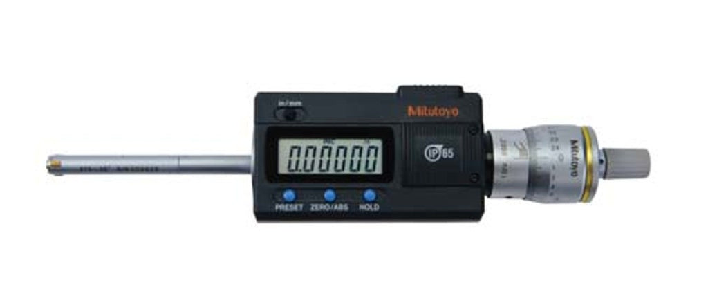 Mitutoyo Digimatic Holtest - 3 Point Internal Micrometer Specifications include... 10-12mm Measuring Range 0.001mm Resolution 2um Accuracy Features include... TiN-coated contact points provide excellent durability, impact resistance, and allow the instrument to measure right to the bottom of a blind hole. Large LCD readout. With Ratchet Stop for constant force. Measurement can be taken closer to the bottom of the blind bore. Can measure deep holes by attaching an Extension rod (optional). Setting rings for origin point setting are optional. Supplied in fitted plastic case. Functions include... Zero-setting, Data hold, Data output, Preset, inch/mm conversion (inch/mm models) Alarm: Low voltage, Counting value composition error