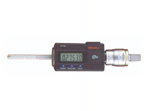 Mitutoyo Digimatic Holtest - 3 Point Internal Micrometer Specifications include... .275" - .350" / 6.925 - 8.89mm Measuring Range 0.00005" / 0.001mm Resolution .0001" Accuracy Features include... TiN-coated contact points provide excellent durability, impact resistance, and allow the instrument to measure right to the bottom of a blind hole. Large LCD readout. With Ratchet Stop for constant force. Measurement can be taken closer to the bottom of the blind bore. Can measure deep holes by attaching an Extension rod (optional). Setting rings for origin point setting are optional. Supplied in fitted plastic case. Functions include... Zero-setting, Data hold, Data output, Preset, inch/mm conversion (inch/mm models) Alarm: Low voltage, Counting value composition error