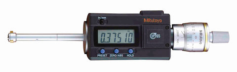 Mitutoyo Digimatic Holtest - 3 Point Internal Micrometer Specifications include... .425" - .500" / 10.795 - 12.7mm Measuring Range 0.00005" / 0.001mm Resolution .0001" Accuracy Features include... TiN-coated contact points provide excellent durability, impact resistance, and allow the instrument to measure right to the bottom of a blind hole. Large LCD readout. With Ratchet Stop for constant force. Measurement can be taken closer to the bottom of the blind bore. Can measure deep holes by attaching an Extension rod (optional). Setting rings for origin point setting are optional. Supplied in fitted plastic case. Functions include... Zero-setting, Data hold, Data output, Preset, inch/mm conversion (inch/mm models) Alarm: Low voltage, Counting value composition error