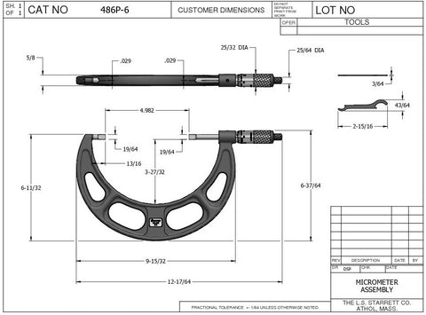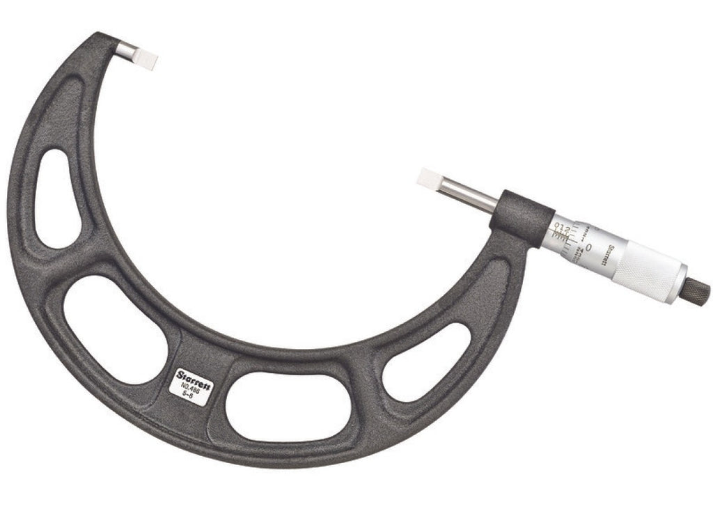 A Blade Micrometer measures the outside diameter of workpieces which have narrow grooves. "T" slots and other features. These Starrett Blade Micrometers are designed for fast, accurate measurements. The balanced design ensures perfect balance, handling and better readability.Features: Measuring Range: 5-6" Graduation: 0.001" 0.030" / 0.8mm Blade Thickness 0.30" / 8mm Blade Depth Non-Rotating Spindle Includes Setting Standard