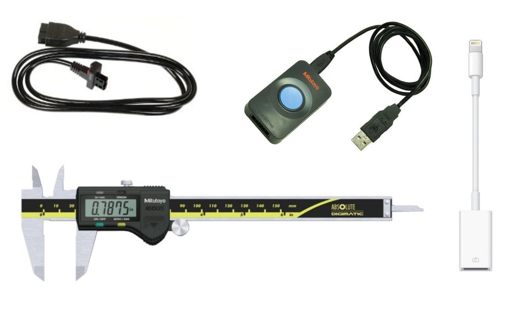 Mitutoyo Caliper to PC or iPad USB Package This complete package provides all of the items required to be able to measure your products with a Mitutoyo 0-6" Digital Caliper, and then send the measured data to either a PC through the included USB Data Input Tool cable, or to an iPad through an Apple Lightning to USB Adapter. The incoming data is converted to a keyboard style entry, so wherever you can type in data is where your incoming data will be placed.Works great with MS Word, Excel..., even SPC software packages. Works with Windows or iPad. Complete package includes the following... Mitutoyo Digital Caliper w/SPC Output 0-6" / 150mm Measuring Range 0.0005" / 0.01mm Resolution Mitutoyo USB Data Input Tool Mitutoyo 1m Caliper Interface Cable Apple Lightning to USB Adapter