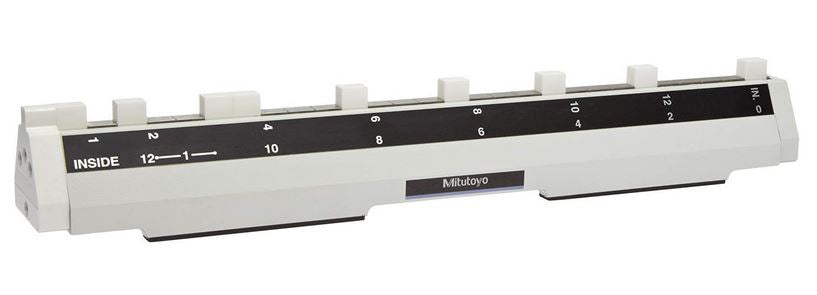 Caliper & Height Gage Checker from Mitutoyo Mitutoyo's setting masters are quick, easy and extremely accurate. Save time and money by calibrating your own measuring tools. Permanently wrung, high grade CERA Gage Blocks in a protective casing. Also stands perpendicular for height gage inspection. Caliper / Height Gage Checker features include... Horizontal and vertical use Used for the calibration of height gages and calipers Scale on one side reads... 1", 2", 4", 6", 8", 10", 12" for inside caliper measurements 1", 2", 4", 6", 8", 10", 12" for outside caliper measurements Scale on other side reads: 1", 2", 4", 6", 8", 10" and 12" for height gage checking Includes Mitutoyo's CERA Gage Blocks