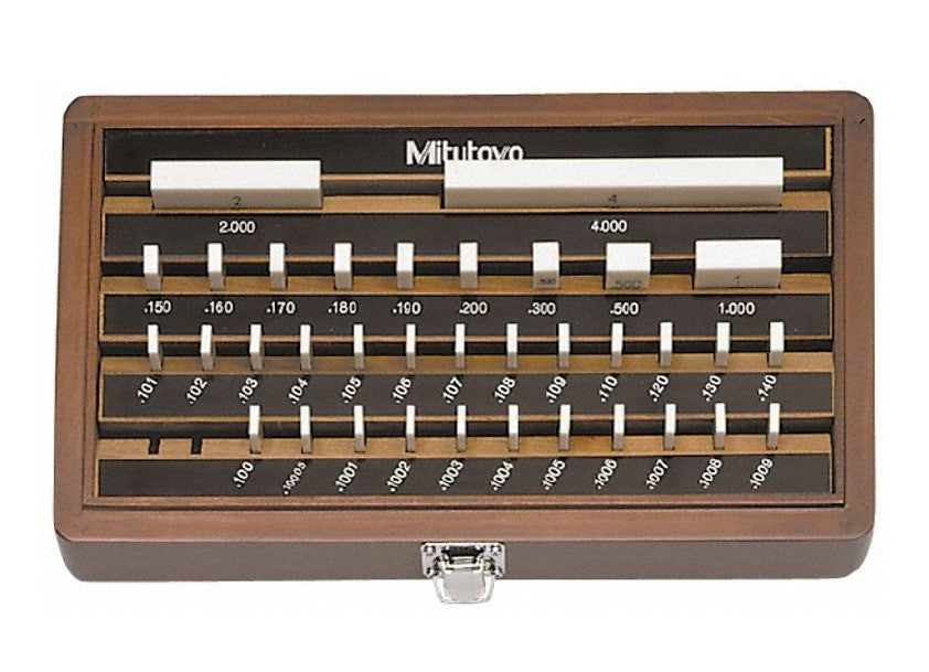 Mitutoyo Inch Rectangular Steel Gage Block Set 35pc, Grade AS-1 Included are the following... 1 block, size .10005" 9 blocks, sizes .1001" - .1009" in .0001" increments 9 blocks, sizes .101" - .109" in .001" increments 9 blocks, sizes .11" - .19" in .01" increments 3 blocks, sizes .1" - .3" in 0.1" increments 1 block ea, sizes .5", 1", 2", 4" Mitutoyo's Ceramic Gage Blocks offer a superior surface quality. Originally developed by Mitutoyo's ultra precision machining techniques to solve all of the problems that the steel gage block had. Features include... Corrosion-Resistant Anti-corrosion treatment is not required when handled normally (i.e. with fingers), resulting in simple maintenance and storage. No Burrs Caused by Dents, etc. Since the CERA Block is very hard, it will not scratch and is highly resistant to burrs. If a burr is formed, it can easily be removed with a ceramic deburring stone (Ceraston). Abrasion Resistant CERA Blocks have 10 times the abrasion resistance of steel gage blocks. Dimensional Stability CERA Blocks are free from dimensional change over time. Marking The black characters, indicating the nominal length, are inscribed by laser and are clearly visible against the white surface of the block. Anti-magnetic Nature Keeps Away Steel Powders High wringing force An even, dense tissue can maintain a strong wringing force. Closest Expansion Coefficient to Steel The thermal expansion coefficient of a CERA Block is quite similar to that of a steel gage block. Highly Resistant Against Drops and Other Shocks. The CERA Block material is one of the toughest ceramics materials. It is extremely difficult to crack under normal use.