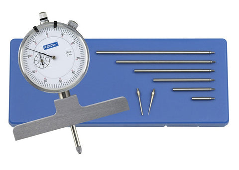 Fowler's Dial Depth Gage comes with six interchangeable rods with a 0-22" capacity, carbide contact point and 2 extra points for small applications. Provides rapid direct reading measurement of hole depths. Indicator Features: 0-1" travel 3/8" stem .001" graduations Special Features: Rod extensions of 1", 2", 3", 4", 5" and 6" are included. Rods can be connected together for a full 0-22" capacity. Includes 2 extra points for small hole applications; one 0.078" dia. x 1" long and one needle point x 1" long. Base is hardened steel, ground and micro lapped for accuracy. Standard 4-48 thread removable carbide ball contact point. Includes shop hardened case.