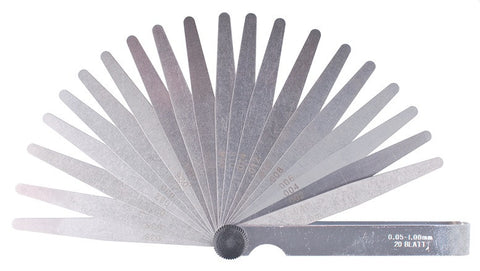 Fowler Inch 26 Leaf Set Tapered Thickness Gage Features include... Each leaf of the thickness gage is made of fine tempered steel, hardened Tapered thickness gage 26 leaf set 0.0015", 0.002", 0.0025", 0.003", 0.004", 0.005", 0.006", 0.007", 0.008", 0.009", 0.010", 0.011", 0.012", 0.013", 0.014", 0.015", 0.016", 0.017", 0.018", 0.019", 0.020", 0.021", 0.022", 0.023", 0.024", and 0.025" 3" in length The exact thickness is marked on each leaf.åÊ Steel case with lock nut. Meets U.S. Federal Specifications
