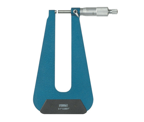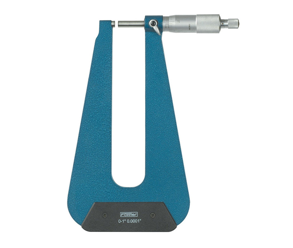 Fowler Mechanical Deep Throat Micrometer Features Include... 0-1" / 25mm Measuring Range 0.0001" Graduations + 0.00016" Accuracy 6" Deep Throat Flat Carbide Tipped Faces on Anvil & Spindle Enamel finish frame. Ratchet Stop. Spindle Lock For sheet metal and similar applications Spindle diameter: 0.256" Furnished in fitted case