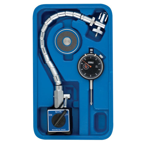 This set allows you to use either the included Magnetic Stand or the Magnetic Back with the Fowler Dial Indicator, mounting to most metal surfaces. Indicator Features Include... 1" Travel .001" Reading .100" Continuous Reading 2.25" Dial Diameter Carbide Tipped Point Black Face Flex Arm Mag Base Features... Corrosion resistant chrome plated flex arm 85 lb pull magnet Holds rigidly in almost any position V-Base for mounting on rounded surfaces Magnetic Indicator Back Features... Use for positioning the indicator on most metal surfaces Protective Coating
