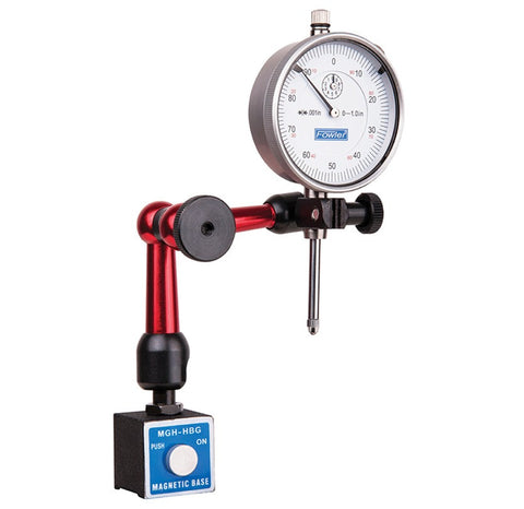 Fowler's Mag Base & Dial Indicator Set Mag Base Features... Accepts all AGD Indicators and test indicators Length of arm: 6" Push button magnetic base Central locking mechanism allows for easy set up of gages AGD Indicator features... 1" Travel 0-100 Face Reading 2 1/4" Face Diameter Revolution Counter Lug Back Mount Carbide Point ONLY 1 Set available at this price!