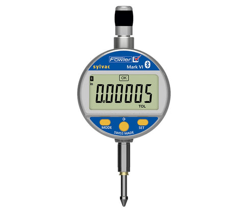 Fowler Mark VI Digital Indicator with LIFETIME WARRANTY Includes Integrated BLUETOOTH Technology Specifications Include... 0-1" / 25mm Measuring Range 0.00005" / 0.001mm Resolution Robust construction Water & Coolant resistant Protection class: IP-67 10,000 hours battery life Customizable menus Aluminum housing Bezel rotates 270° Large display with LEDS to tolerance integrated lift lever. Functions include... MIN / MAX / DELTA TOL Factor Preset Auto off LIFETIME WARRANTY from Fowler Send data directly to a Bluetooth cell phone or Tablet with the FREE Sylvac BT Smart app. To be able to send data to a PC, you will need to also buy the Fowler USB Bluetooth Receiver for that PC. You can have up to 8 different gages sending data to the 1 PC through this Bluetooth Receiver.