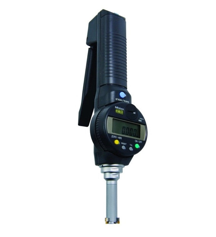 Mitutoyo Borematic w/ SPC Output Specifications include... Measuring Range: 1.200" - 1.600" / 30.48 - 40.64mm Resolution: 0.00005" / 0.001mm The Borematic enables the operator to take measurements more accurately and more quickly than ever before. Once the origin point is set with the ORIGIN button, the Borematic retains the setting for the entire battery life. Therefore no longer repeated origin setting (presetting) is necessary. Titanium-coated measuring pins provide excellent durability and impact resistance and allow the instrument to measure right to the bottom of a blind hole. Features include... Large LCD digits of 8.5mm height for error-free reading. 330° rotatable display unit for easy reading at any angle. GO/NO-GO judgment function. The ABSOLUTE linear encoder eliminates the fear of over-speed errors. Measurement can be taken closer to the bottom of a blind bore TiN-coated measuring contact points With SPC data output Supplied in fitted wooden case Setting rings for origin point setting are optional.