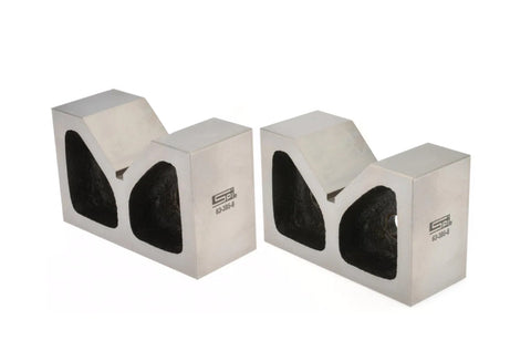 Precision ground matched pairs made of cast iron grade 20 Accuracy... Flatness: 0.0005" Parallelism: 0.0008" Perpendicularity: 0.0008" Size... Width: 5" V-Opening: 2 7/16" Height: 3 1/16" Length: 1 15/16"
