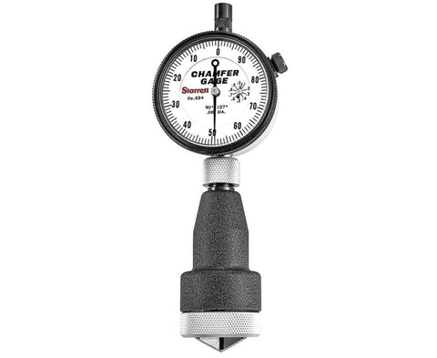 Starrett Chamfer Gage These Chamfer Gages provide instant measuring of chamfers and tapered hole diameters. Specifications include... 0-1" Capacity 90° -127° Angle Range Direct Diameter Reading to 0.001" Features include... When the three-blade plunger is pressed against a flat surface, the gage should read the set number stamped on the back of the indicator. No setting master is necessary. Internal gages will measure the largest diameter of any chamfer that has an included angle within the range of angles printed on the dial face. Gages are also available with electronic indicators on request. Deluxe Padded Case. All ground surfaces are of hardened tool steel. Indicators are AGD design