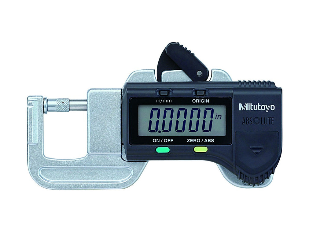 Mitutoyo Quick Mini Thickness Gage The Quick Mini is a convenient snap-action pocket thickness gage offering LCD digital readout. This is ideal for rapid checking of a wide variety of materials including metal, paper, plastics and wood. Features include... 0-.5" / 0-12.7mm Measuring Range .0005" / .01mm Resolution 0.001" Accuracy Measuring Force less than 2N LCD Display Supplied in fitted case Functions include... Zero-setting, Data Hold, in / mm conversion