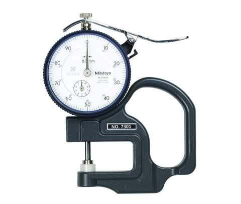 Mitutoyo Dial Thickness Gage A precision measuring tool that simplifies inspection tasks with its ergonomic handle, user-friendly thumb trigger, and automatic spindle. Features include... 0-10mm Measuring Range 0-30mm Throat Depth 0.01mm Graduations 10mm Anvil Diameter Measuring faces constructed in high grade tool steel; hardened, ground and lapped. Direct reading 0-100 (with revolution counter) on easy-to-read dial Frame is hammertone baked enamel Spindle of hardened stainless steel Features a thumb Lifting Lever