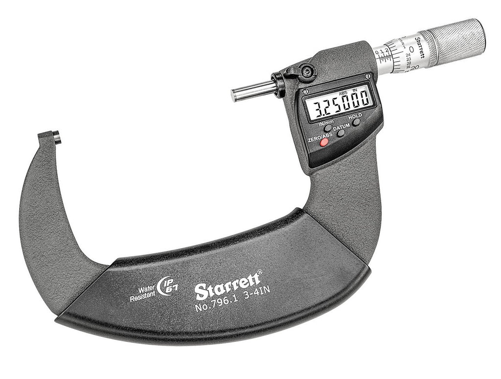 Starrett Electronic Micrometer The Starrett 796.1 Electronic Micrometers provide an IP67 level of protection against coolant, water, chips, dirt, dust, and other contaminants in hostile shop environments. The 796.1 Electronic micrometers are built with customary Starrett quality and workmanship. Features include... 3-4” / 75-100mm Measuring Range 0.00005” / 0.001mm Resolution IP67 Rated Protection No SPC Output