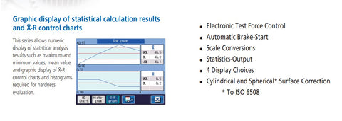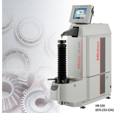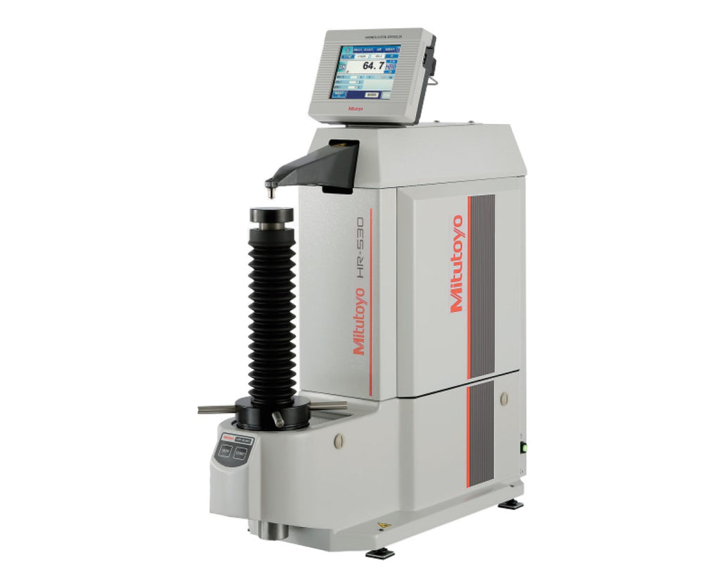 Mitutoyo Rockwell & Rockwell Superficial Type Hardness Tester The closed loop test force control on the Mitutoyo HR-530 Rockwell and Brinell Hardness Tester allows for a wide variety of hardness testing including plastics. The HR-530 is capable of testing the inside wall hardness of rings without cutting the ring into pieces. An easy to use brake-start system automatically begins testing when initial force is reached. The curved surface correction function enables curved surfaces, such as round bars and spheres, to be tested for hardness as easily as flat surfaces. Color touch screen control panel displays statistics and graphs; up to five display formats show needed information. Nose-type indenter enables measurement of a specimen's flat top surface as well as inside surface of cylindrical specimen. The HR-530 is available in 9.8" (250mm) or 15.5" (395mm) height capacity models. Complete with a combination diamond indenter, a 1/16" carbide ball indenter, one flat and one V anvil, 2 HRC, 1 HRBW, 1 HR30TW and 1 HR30N test block. Hardness testing of plastics according to ASTM D785 (Procedure A and B) and ISO2039-2 are also possible. Technical Data... Preliminary test force: 29.42N, 98.07N Test force setting: By control unit Load control: Automatic (loading, duration, unloading) Load duration: 0s - 120s (1s increments) Max. specimen height: 9.8" / 250mm Max. specimen depth: 5.9" / 150mm Stage elevation: Manual or power drive Control unit: Sheet switch type or touch screen type Data output: RS-232C, Digimatic code (SPC) and USB 2.0 Power supply: 120V AC Dimensions (W x D x H)... Main unit: 9.84" x 26.38" x 23.82" Control unit: 7.52" x 5.79" x 2.80" Rockwell Test Force... 588.4N / 60kgf 980.7N / 100kgf 1471N / 150kgf Rockwell Superficial Test Force... 147.1N / 15kgf 294.2N / 30kgf 441.3N / 45kgf Package includes... Main unit with Diamond Indenter 1/16" Ball Indenter 1/16" Spare Ball Flat Anvil V-Anvil Display with Mounting Bracket Hardness Test Blocks 30-35HRC, 60-65HRC, 90-95HRC 64-69HR30N, 70-79HR30T Power cord, vinyl cover, users manual FREE Ground Freight to any Continental USA location. View a pdf brochure on this product... Click Here