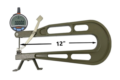 Deep Throat Digital Thickness Gage with Roller Contacts and Mitutoyo Digital Indicator This Deep Throat Thickness Gage includes special J50R Roller Contacts designed to measure the thickness of thin, moving material. The gage includes a 0-0.5" measuring range with a 0-12" deep reach, allowing you to measure thickness in hard to reach places. The attached lifting lever makes for one-handed operation. Includes Mitutoyo Digital Indicator with Data Output Capabilities. Features include... 0-0.5" / 10mm Measuring Range 0.0005" / 0.010mm Resolution SPC Output 12" Reach J50R Roller Contacts specifications... 0.331" / 8.4mm Diameter 0.343" / 8.7mm Wide This gage takes approximately 1-2 weeks for production before shipping.