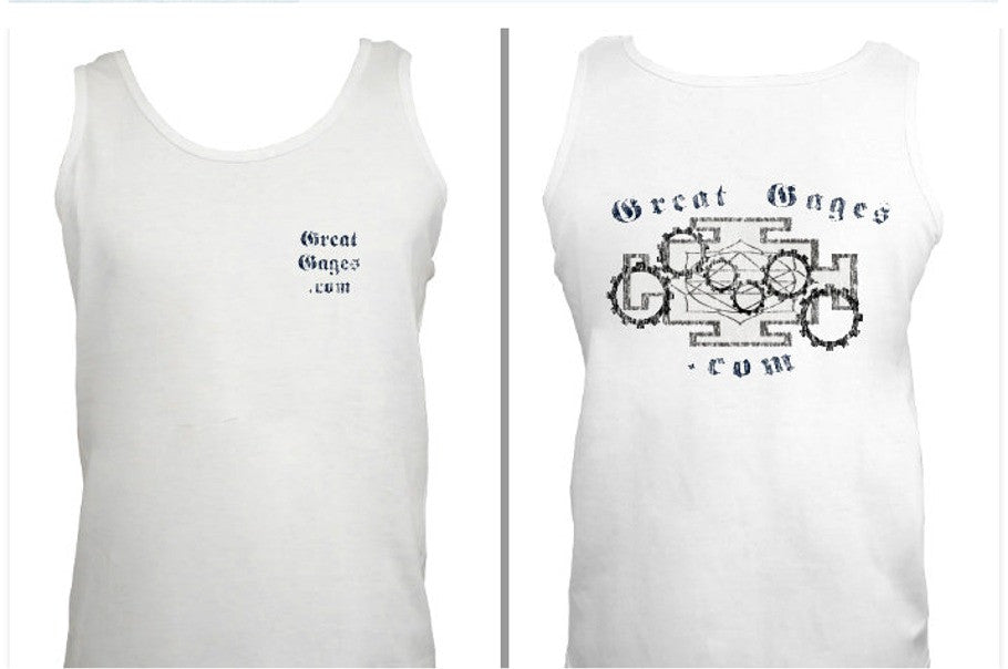 100% Cotton 2200 Gilden Ultra Cotton White Tank Top Tee Shirt Printing on front & back. GreatGages.com Logo