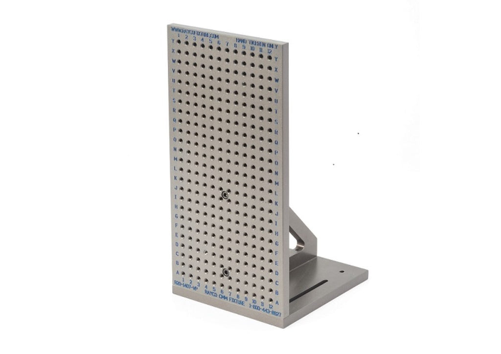 Rayco CMM Vertical Fixture Plate Rayco cast aluminum fixture plates are the toughest plates on the market, all of their plates are Hard-Coat Anodized for added strength. We offer plates for all size machines and applications. RAYCO CMM FIXTURE has been the leading CMM Fixture brand and in business for 33 years. Features include... 12" x 5" x 0.5" Plate 5" x 6" Base Plate 1/4-20 threaded holes spaced apart, 0.5" center to center Engraved Numbers on X-Axis Engraved Letters on Y-Axis